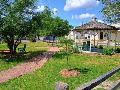 In 1999, as a Big Event project (an annual one day event to beautify Commerce), the Commerce Public Library and the Literacy Program sponsored the clearing of the lot and added simple landscaping to the area. In 2000, the coordinators of the Big Event decided to expend the work done on the improved lot by designating it as "Authors' Park" and devised an elaborate landscaping plan that included the installation of a sprinkler system and the fourteen-foot gazebo.
